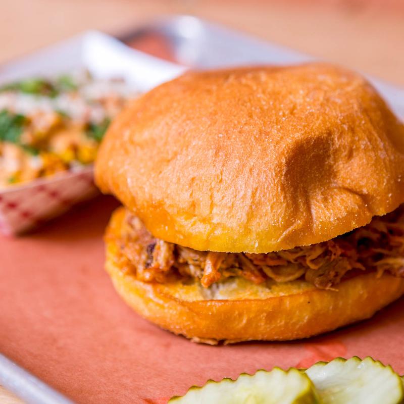 Choice of (2): Chopped Brisket, Pulled Pork, or Sausage, with coleslaw and pickled onions.